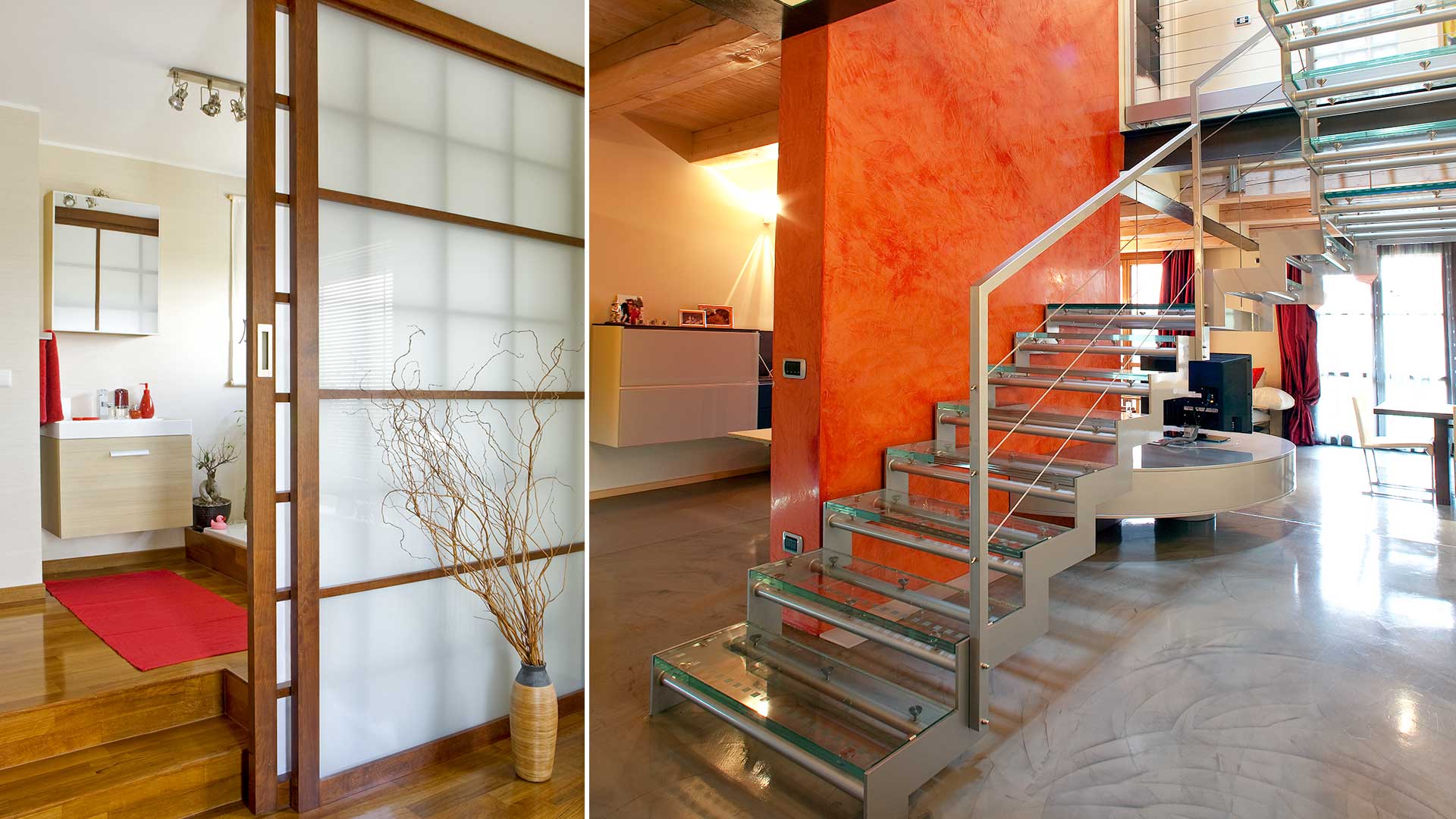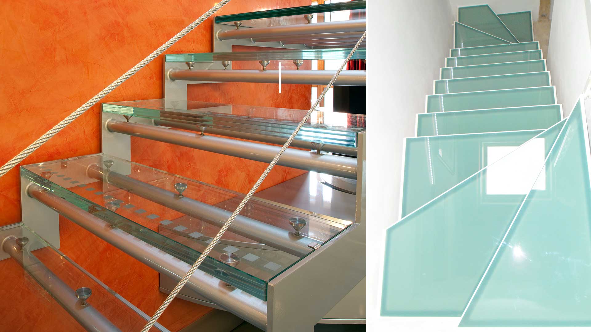 Realizziamo parapetti per scale in cristallo, pensiline in vetro, gradini e vetri per soppalchi, porte in vetro scorrevoli a scomparsa o esterne.