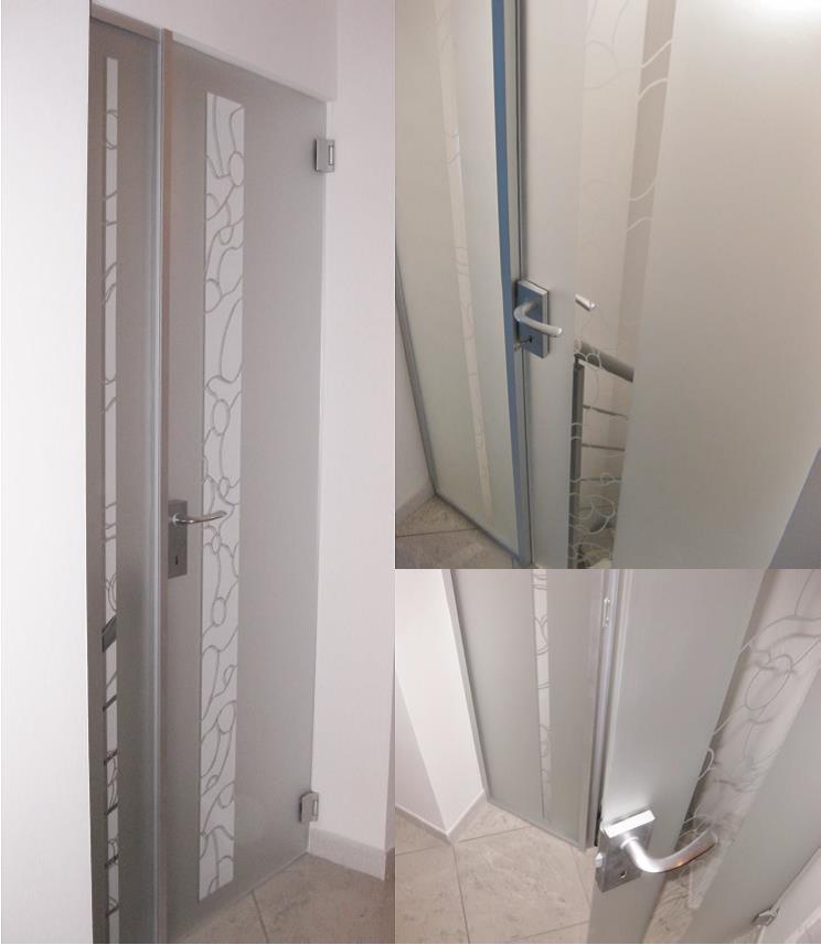 Chiusura scala in cristallo extrachiaro sabbiato a disegno, costituita da un vetro fisso stratificato e intelaiato anti-caduta nel vuoto, porta in battuta con cerniera libera e maniglia con serratura magnetica.